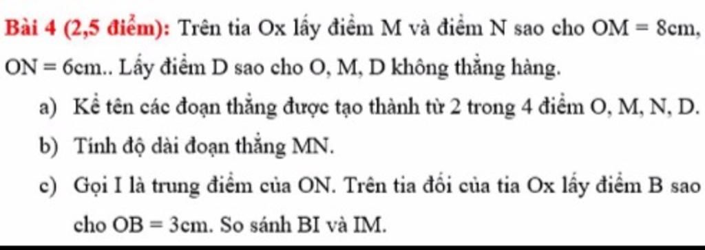 Bài 4 (2,5 điểm): Trên tia Ox lấy điểm M và điểm N sao cho OM = 8cm,