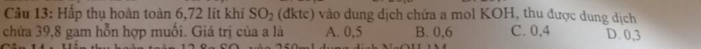 um tạo ra 2 muối thì sẽ có PTHH: $SO_2+2KOH\to K_2SO_3+H_2O$ $SO_2+KOH\to KHSO_3$