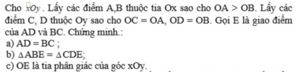 `=> \hat{EOB}=\hat{EOD} => OE` là tia phân giác của `\hat{xOy}`