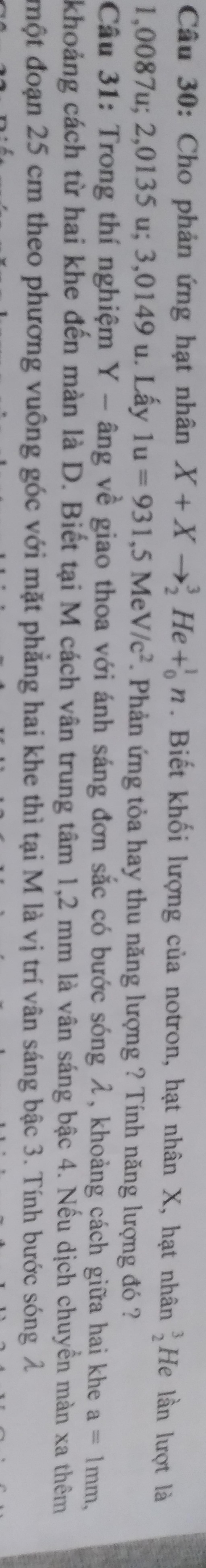 Câu 30: Cho phản ứng hạt nhân X + X →, He+ n . Biết khối lượng của notron, hạt nhân X, hạt nhân He lần lượt là