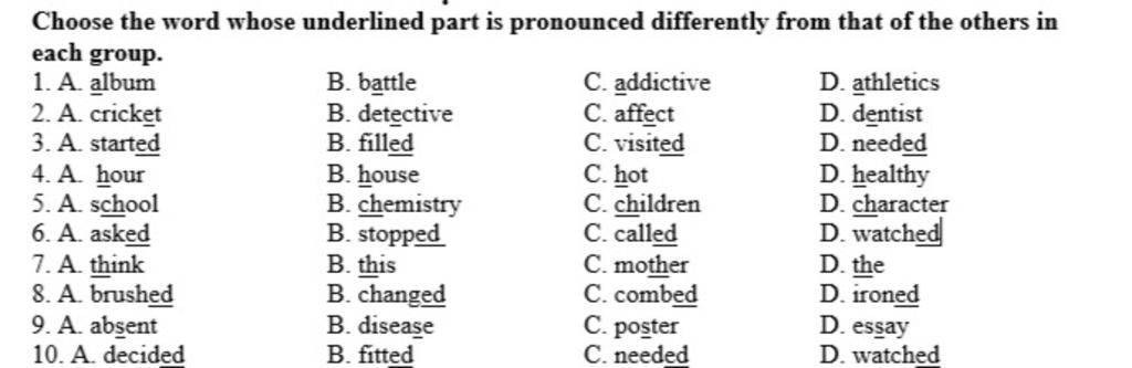 `8. A` (đáp án: /t/, còn lại: /d/)