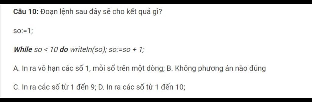 - Câu lệnh luôn được thực hiện vì so < 10 luôn đúng