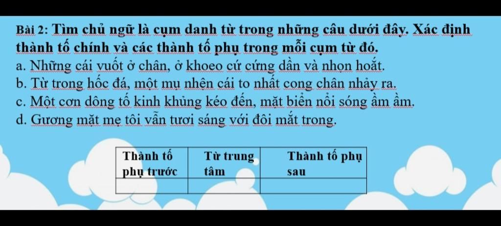 Bài 2: Chủ ngữ là cụm danh từ trong những câu trên: