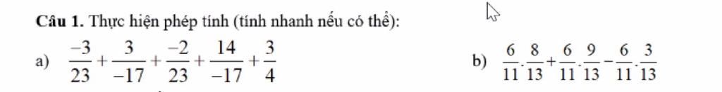 `a ) (-3)/23 + 3/(-17) + (-2)/23 + 14/(-17) + 3/4`