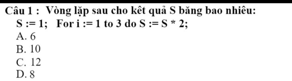 `->` s ban đầu bằng 1 và lặp s:=s*2 ba lần nên s=1*2*2*2=8
