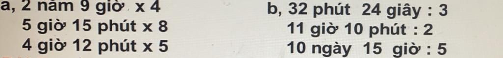 a) 2 năm 9 giờ x 4=8 năm 36 giờ b) 32 phút 24 giây :3=8phút 1 giây