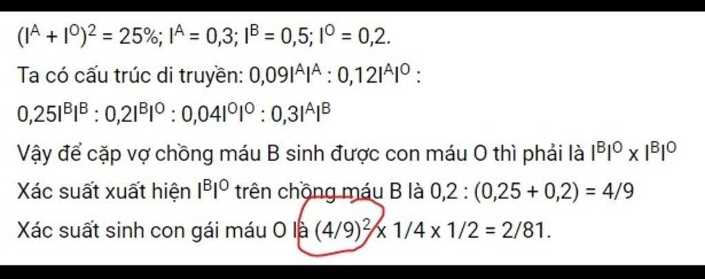 Xác suất xuất hiện IB1° trên chồng máu B là 0,2 : (0,25 + 0,2) = ...