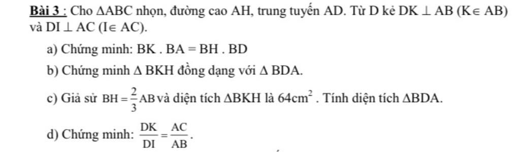 Bài 3 : Cho AABC nhọn, đường cao AH, trung tuyển AD. Từ D kẻ DKI AB (KE AB)