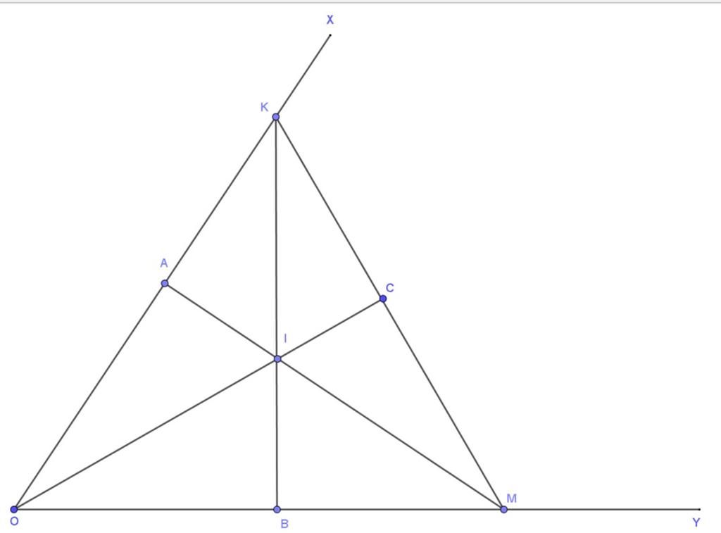 Cho góc nhọn xOy . Gọi I là một điểm bất kỳ nằm trên tia phân giác của ∠xOy. Kẻ IA ⊥Ox, cắt Oy tại M và IB ⊥Oy cắt Ox tại K