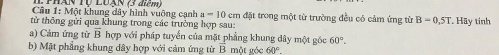 Câu 1: Một khung dây hình vuông cạnh a = 10 cm đặt trong một từ trường đều có cảm ứng từ B = 0,5T. Hãy tính