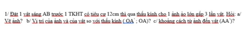 1/ Đặt 1 vật sáng AB trước 1 TKHT có tiêu cư 12cm thì qua thấu kính cho 1 ảnh ảo lớn gấp 3 lần vật Hoi: a/