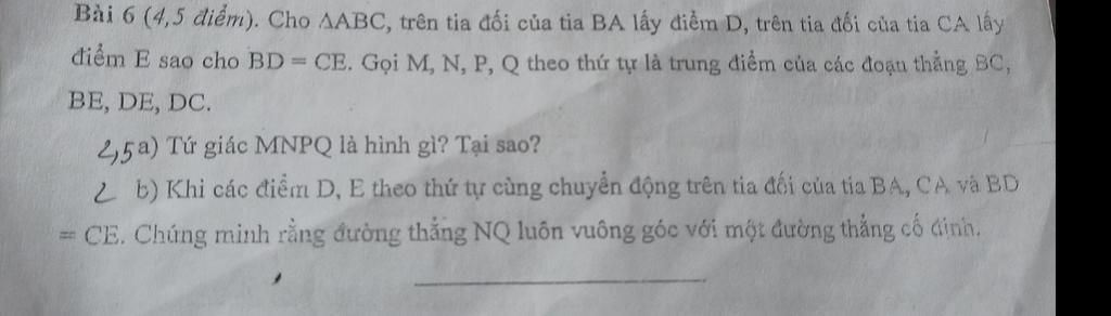 điểm E sao cho BD CE. Gọi M, N, P, Q theo thứ tu là trung diểm của các doạn thắng BC,