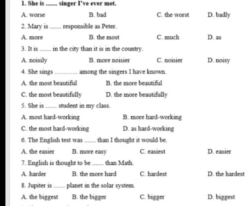 1Câu này dùng superlative vì có I've ever met: Cô ấy là ca sĩ tệ nhất mà tôi đã từng gặp => C