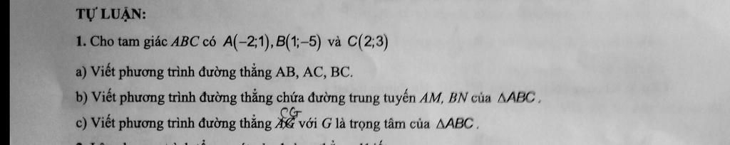 `=>` Phương trình trung tuyến `BN` qua `B(1;-5)` có `\vec{n}_{BN}=(7;1)` là: