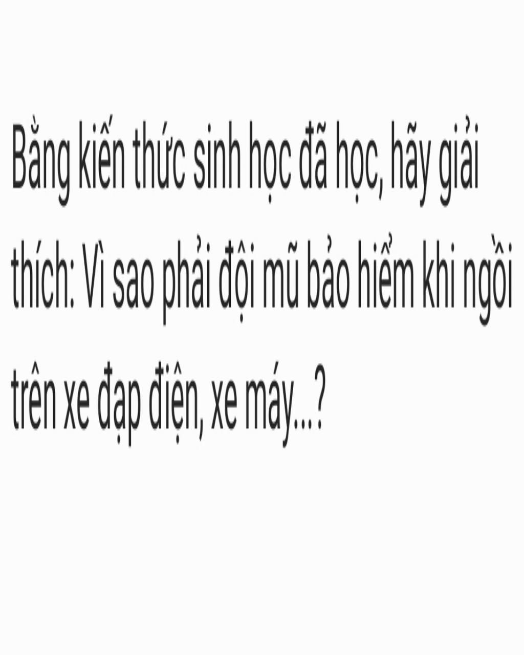 -Khi đầu va chạm mạnh với đất gây ra chấn động và những tổn thương trực tiếp tới não.Hầu hết các đường thần kinh cảm giác từ các phần dưới đi lên não và các đường thần kinh vận động đi từ não xuống . Nếu não bị tổn thì sẽ gây ảnh hưởng đến toàn bộ cơ thể bên dưới. Đội mũ bảo hiểm để giảm những tác động trực tiếp gây ảnh hưởng tới đầu não từ đó giảm thiểu các chấn thương về não là đảm bảo một phần an toàn của bản thân.