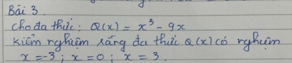 `Q(3)=3^3-9.3=27-27=0` (vậy x=3 là nghiệm đa thức Q(x) )