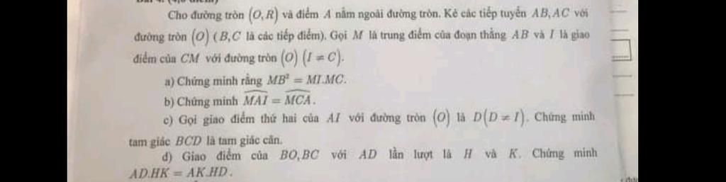 đưong tròn (0) (B,C là các tiếp điểm). Gọi M là trung điểm của đoạn thẳng AB và I là giao