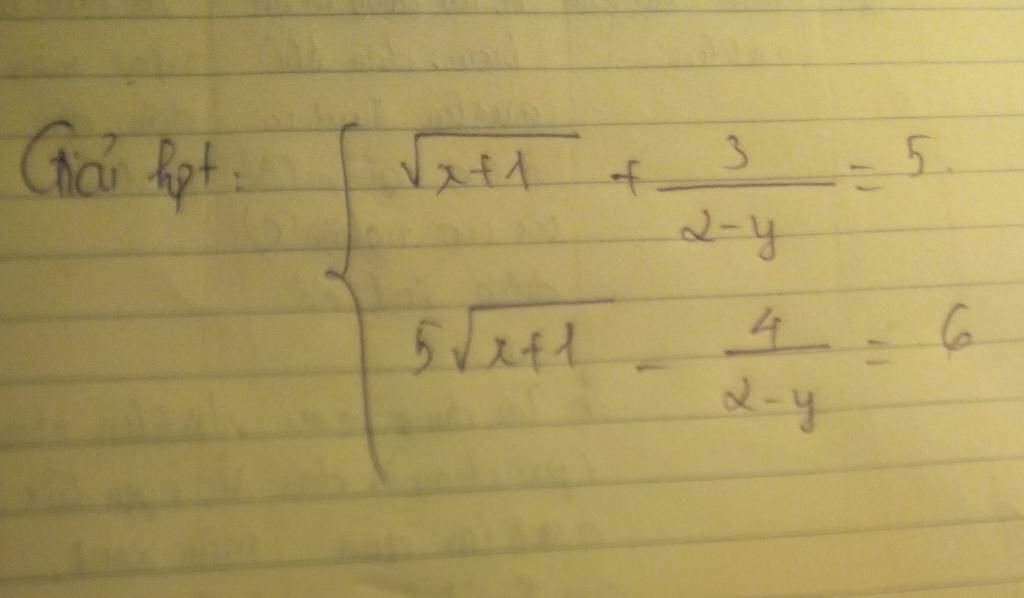$\begin{cases} \sqrt{x+1}+\dfrac{3}{2-y}=5\\5\sqrt{x+1}-\dfrac{4}{2-y}=6\\ \end{cases}$
