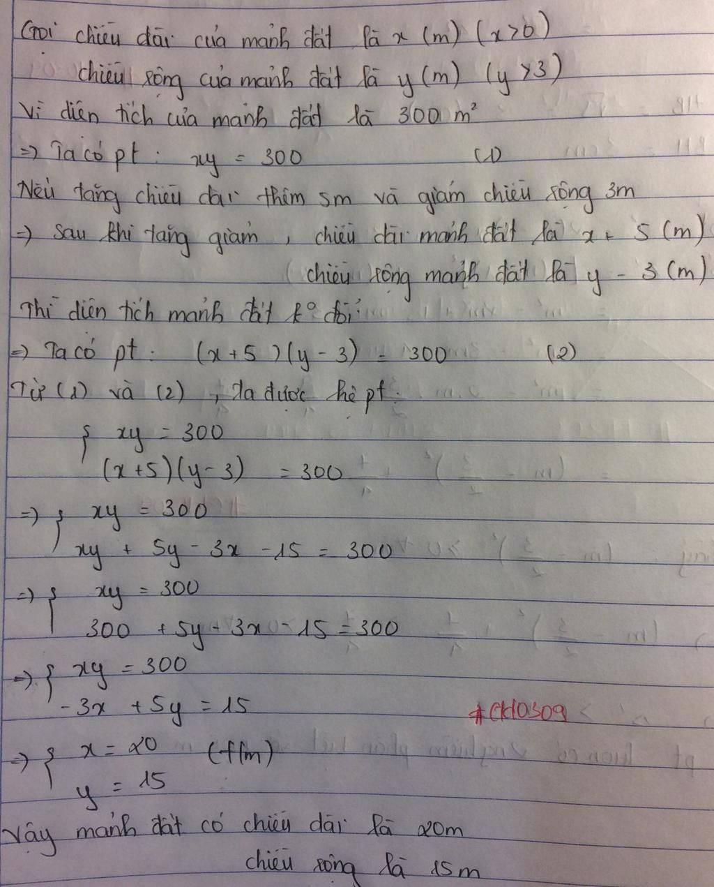 Một mảnh đất hình chữ nhật có diện tích bằng 300m2 . Nếu tăng chiều dài của nó thêm 5m và giảm chiều rộng 3m thì diện tích mảnh đất ấy vẫn không thay đổi. Tính chiều dài và chiều rộng của mảnh đất.