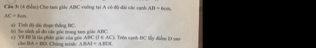 Câu 3: (4 điểm) Cho tam giác ABC vuông tại A có độ dài các cạnh AB 6cm,