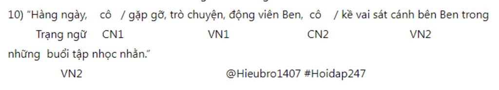 Câu 11. Câu ghép: “Hàng ngày, cô gặp gỡ, trò chuyện, động viên Ben, cô kề vai sát cánh bên Ben trong những buổi tập nhọc nhằn.” có mấy vế câu?