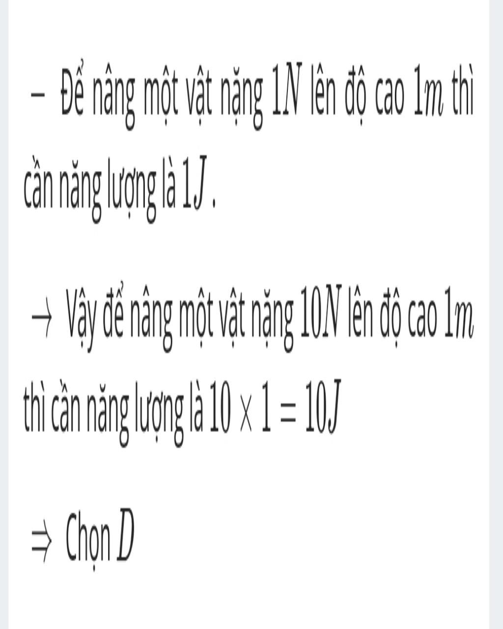 → Vậy để nâng một vật nặng 10N lên độ cao 1m thì cần năng lượng là 10×1=10 J