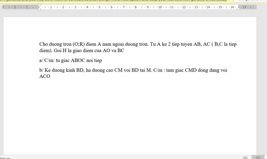Cho duong tron (O;R) diem A nam ngoai duong tron. Tu A ke 2 tiep tuyen AB, AC ( B,C la tiep