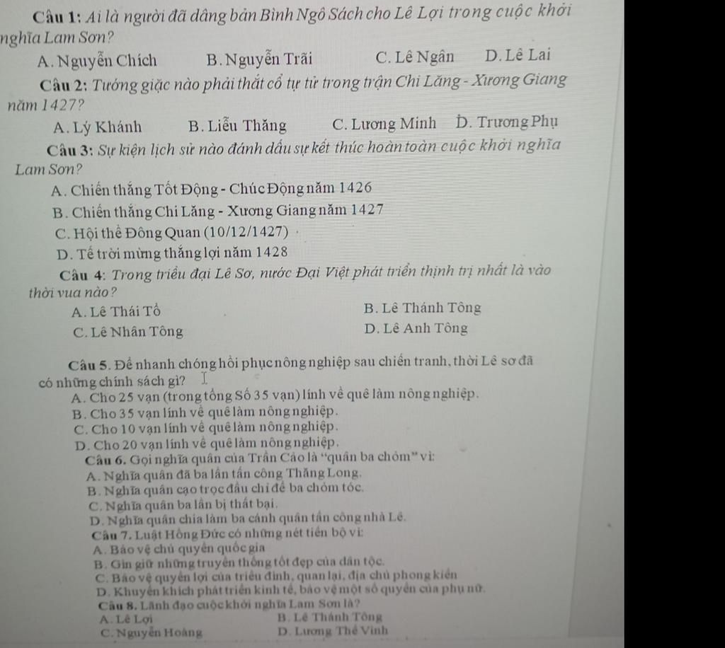 `=>1` câu nhỏ trong phần đề cương mk hc : Năm `1418` Lê Lợi dựng cờ khởi nghĩa ở Lam Sơn , tự xưng là Bình Định Vương