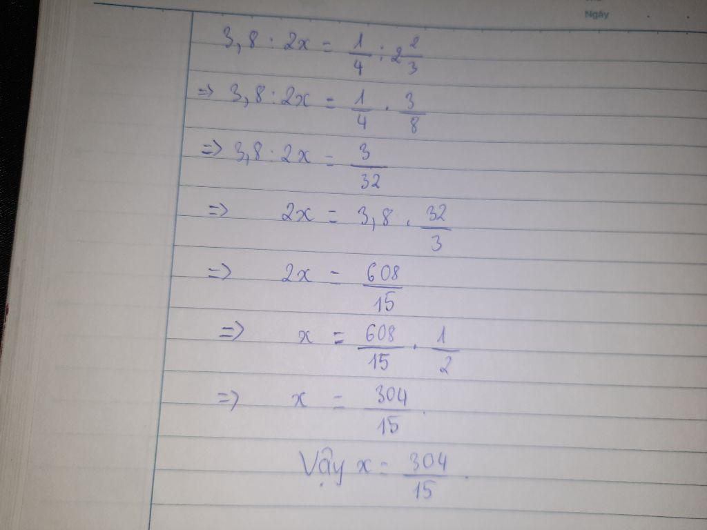 $3,8 : 2x = \dfrac{1}{4}:2\dfrac{2}{3}\\⇔ \dfrac{19}{5}:2x= \dfrac{1}{4} : \dfrac{8}{3}\\⇔ \dfrac{19}{5} : 2x = \dfrac{1}{4} . \dfrac{3}{8}\\⇔\dfrac{19}{5} : 2x = \dfrac{3}{32}\\⇔ 2x = \dfrac{19}{5} : \dfrac{3}{32}\\⇔ 2x = \dfrac{19}{5} . \dfrac{32}{3}\\⇔2x= \dfrac{608}{15}\\⇔ x = \dfrac{304}{15}$
