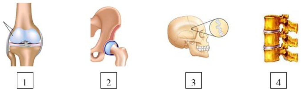 Trong 4 hình này, hình 1 + 2 là khớp động, hình 3 là khớp bất động còn hình 4 là khớp bán động.
