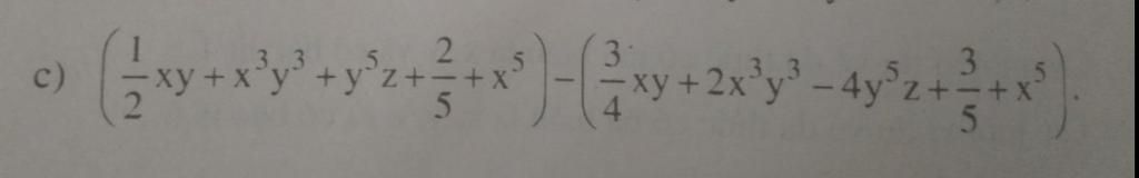 `c) (1/2 xy + x^3 y^3 + y^5 z + 2/5 + x^5) - (3/4 xy + 2 x^3 y^3 - 4 y^5 z + 3/5 + x^5)`