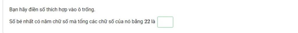Vậy số nhỏ nhất cần tìm là: 10399 thỏa mãn điều kiện tổng 5 chữ số bằng 22.