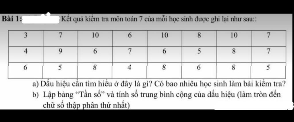 a) Dấu hiệu cần tìm hiểu ở đây là gì? Có bao nhiêu học sinh làm bài kiểm tra?