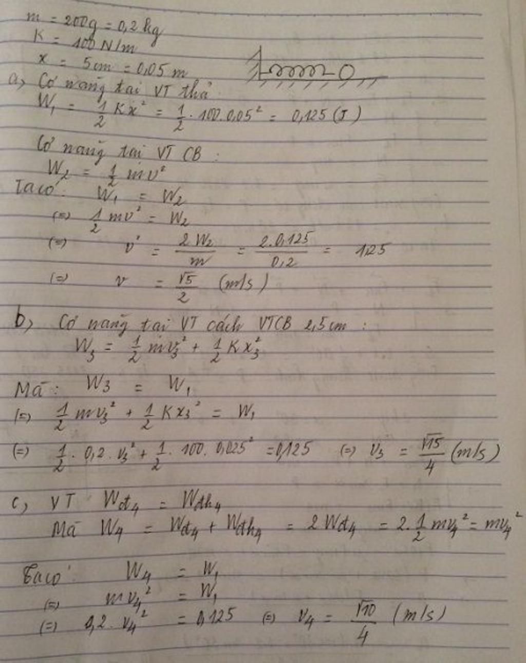 Một vật có khối lượng 200g gắn vào đầu một lò xo nhẹ đặt nằm ngang. Vật có thể trượt không ma sát trên mặt phẳng nằm ngang. Lò xo có độ cứng 150N/m, đầu kia được gắn cố định. Kéo vật ra khỏi vị trí cân bằng ( vị trí lò xo không bị biến dạng) sao cho lò xo bị dãn 5cm rồi buông nhẹ. Gốc thế năng được chọn tại vị trí lò xo không bị biến dạng.