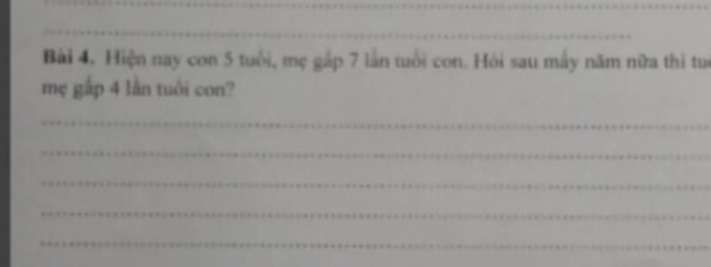 Vậy sau `5` năm thì tuổi mẹ sẽ gấp `4` lần tuổi con.