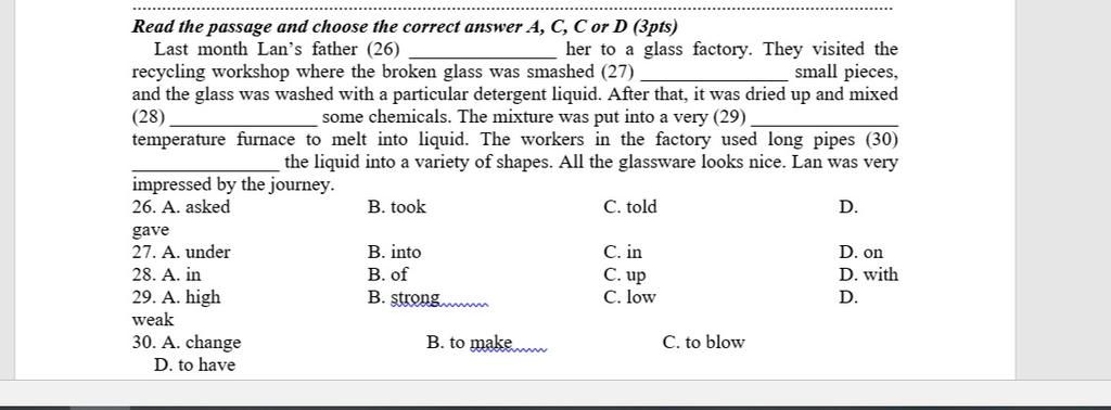 Read the passage and choose the correct answer A, C, C or D (3pts)