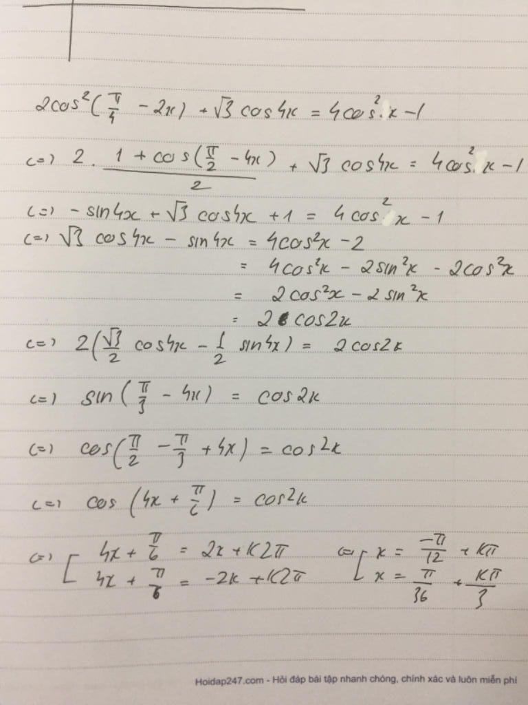 1+sin4x+√3cos4x=4cos2x−1<=>sin4x+√3cos4x=4cos2x−2=2cos2x<=>12sin4x+√32cos4x=cos2x<=>cos(4x−Π6)=cos2x