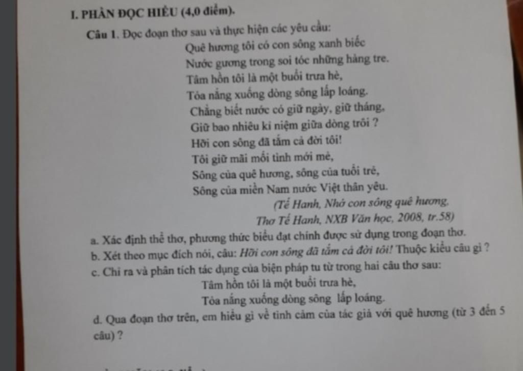 Câu 1. Đọc đoạn thơ sau và thực hiện các yêu cầu: