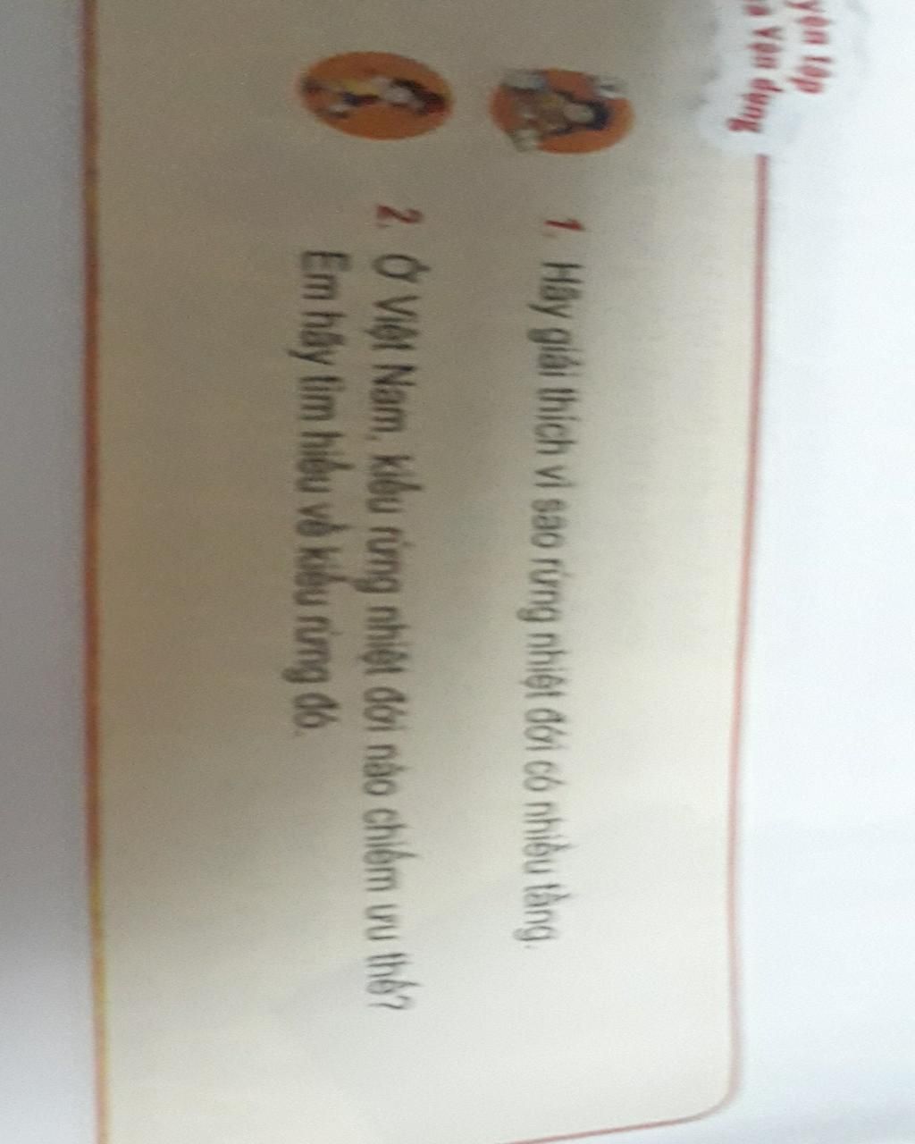 1. Rừng nhiệt đới phân bố ở khu vực có nhiệt độ cao, độ ẩm lớn, lượng mưa nhiều là điều kiện rất thuận lợi cho các loài thực vật phát triển. Vì vậy, rừng có nhiều tầng, tầng dưới là cây bụi, tầm gửi, phong lan, dây leo,... là những cây chịu bóng, các tầng cao hơn là các cây thân gỗ...