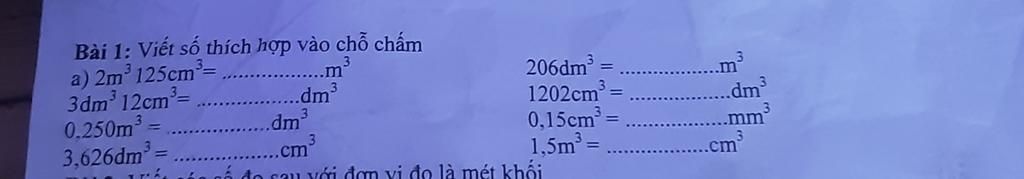 a) 2m3 125cm3 = 2 $\frac{125}{1000000}$ m3 = 2,1000125m3