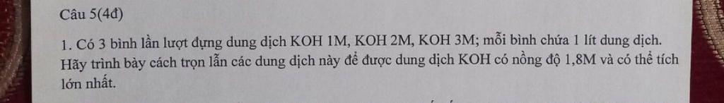 Sau đó trộn các dung dịch $KOH$ lại với nhau thì thu được dung dịch $KOH$ có nồng độ mol $1,8M$ và thể tích $2,5l$ là thê tích lớn nhất sau khi bớt.