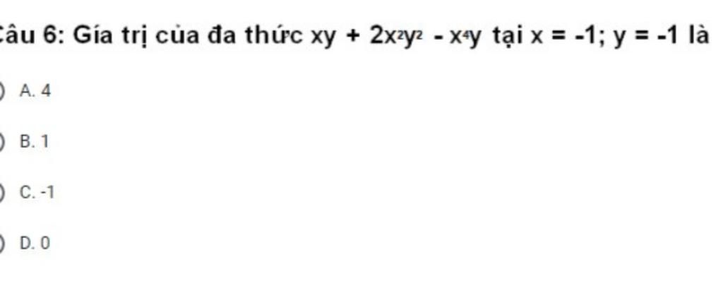 Thay `x=-1;y=-1` vào đa thức `xy+2x^2y^2-x^4y` có: