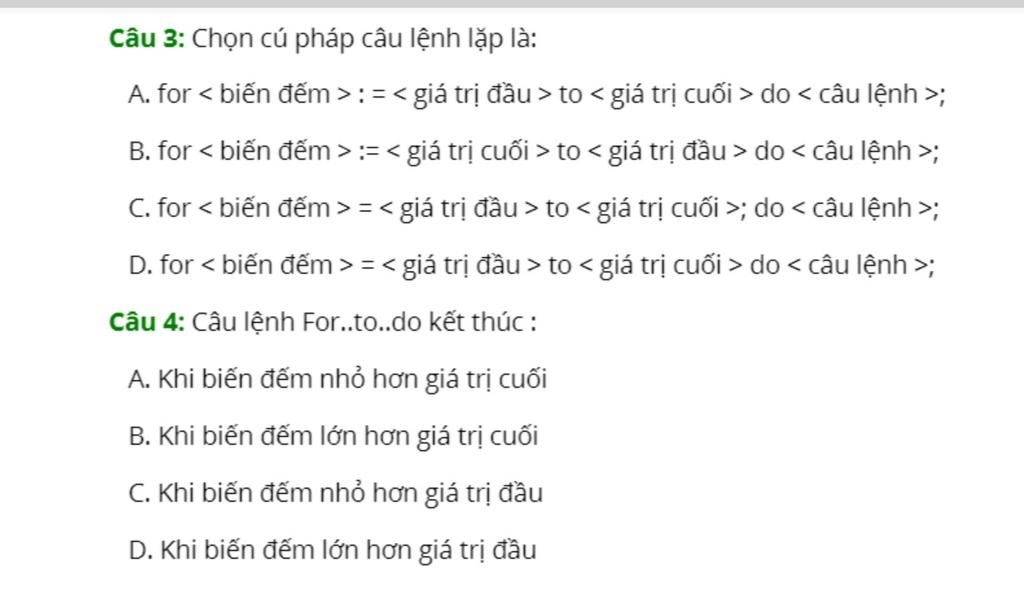 ⇒ Đáp án : A. For <Biến đếm> := <Giá trị đầu> to <Giá trị cuối> do <Câu lệnh>;