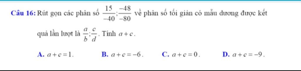 Rút gọn các phân số `15/-40 ; (-48)/(-80)` về phân số tối giản có mẫu dương ta được kết quả lần lượt là: `(-3)/8 ; 3/5`