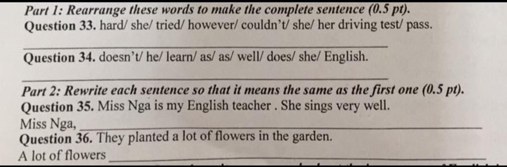 1 She tried hard. However, she couldn't pass her driving test 2 He doesn't learn English as well as she Part 2 35 Miss Nga, who sings very well is my teacher 36 A lot of flowers are planted in the garden
