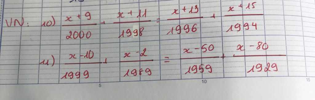 $\begin{array}{l} 10)\dfrac{{x + 9}}{{2000}} + \dfrac{{x + 11}}{{1998}} = \dfrac{{x + 13}}{{1996}} + \dfrac{{x + 15}}{{1994}}\\ \Leftrightarrow \dfrac{{x + 9}}{{2000}} + 1 + \dfrac{{x + 11}}{{1998}} + 1 - \left( {\dfrac{{x + 13}}{{1996}} + 1} \right) - \left( {\dfrac{{x + 15}}{{1994}} + 1} \right) = 0\\ \Leftrightarrow \dfrac{{x + 2009}}{{2000}} + \dfrac{{x + 2009}}{{1998}} - \dfrac{{x + 2009}}{{1996}} - \dfrac{{x + 2009}}{{1994}} = 0\\ \Leftrightarrow (x + 2009)\left( {\dfrac{1}{{2000}} + \dfrac{1}{{1998}} - \dfrac{1}{{1996}} - \dfrac{1}{{1994}}} \right) = 0\\ \Leftrightarrow x + 2009 = 0\\ \Leftrightarrow x = - 2009\\ 11)\dfrac{{x - 10}}{{1999}} + \dfrac{{x - 20}}{{1989}} = \dfrac{{x - 50}}{{1959}} + \dfrac{{x - 80}}{{1929}}\\ \Leftrightarrow \dfrac{{x - 10}}{{1999}} - 1 + \dfrac{{x - 20}}{{1989}} - 1 - \left( {\dfrac{{x - 50}}{{1959}} - 1} \right) - \left( {\dfrac{{x - 80}}{{1929}} - 1} \right) = 0\\ \Leftrightarrow \dfrac{{x - 2009}}{{1999}} + \dfrac{{x - 2009}}{{1989}} - \dfrac{{x - 2009}}{{1959}} - \dfrac{{x - 2009}}{{1929}} = 0\\ \Leftrightarrow (x - 2009)\left( {\dfrac{1}{{1999}} + \dfrac{1}{{1989}} - \dfrac{1}{{1959}} - \dfrac{1}{{1929}}} \right) = 0\\ \Leftrightarrow x - 2009 = 0\\ \Leftrightarrow x = 2009 \end{array}$