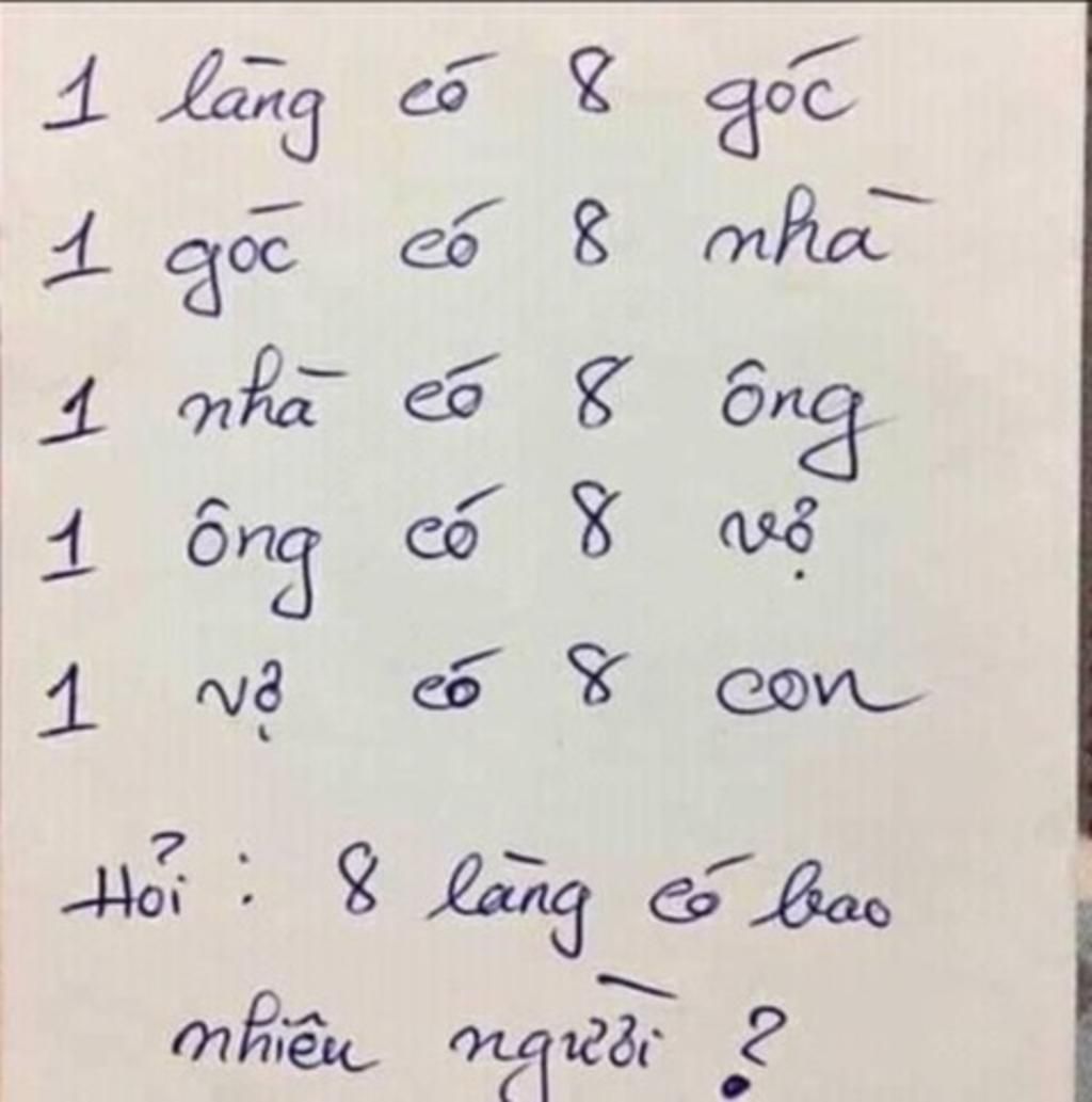 1 làng có 8 góc, 1 góc có 8 nhà" tức là chỉ có 1 góc có 8 nhà. Còn "1 làng có 8 góc, mỗi góc có 8 nhà" tức là 1 làng có 8 x 8 = 64 góc.