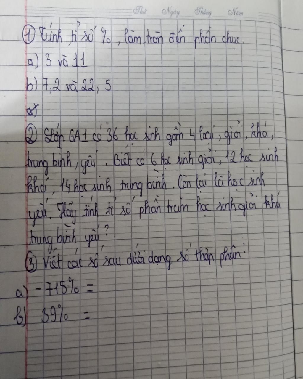 - Số học sinh yếu là: 36 - ( 6 + 12 + 14 ) = 4 (Hs)