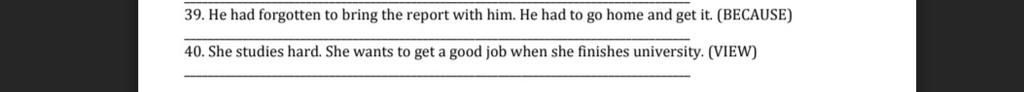- Vế trước chỉ nguyên nhân "anh ấy đã quên mang theo báo cáo", vế sau là kết quả của nguyên nhân được nêu ở vế trước "anh ấy phải về nhà và lấy nó" -> Dùng liên từ chỉ nguyên nhân - kết quả "because : vì"