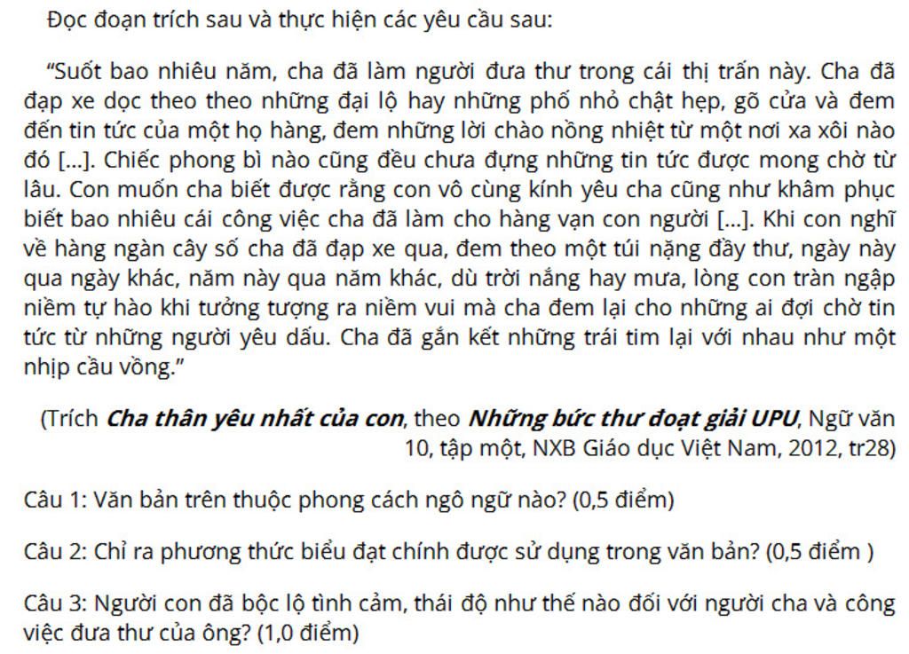 `-` Tình cảm, thái độ của người con đối với người cha: kính yêu “ con vô cùng kính yêu cha…”; với công việc đưa thư của ông: khâm phục, tự hào… “khâm phục biết bao nhiêu cái ông việc cha đã làm cho hàng vạn con người, lòng con tràn ngập niềm tự hào...”.